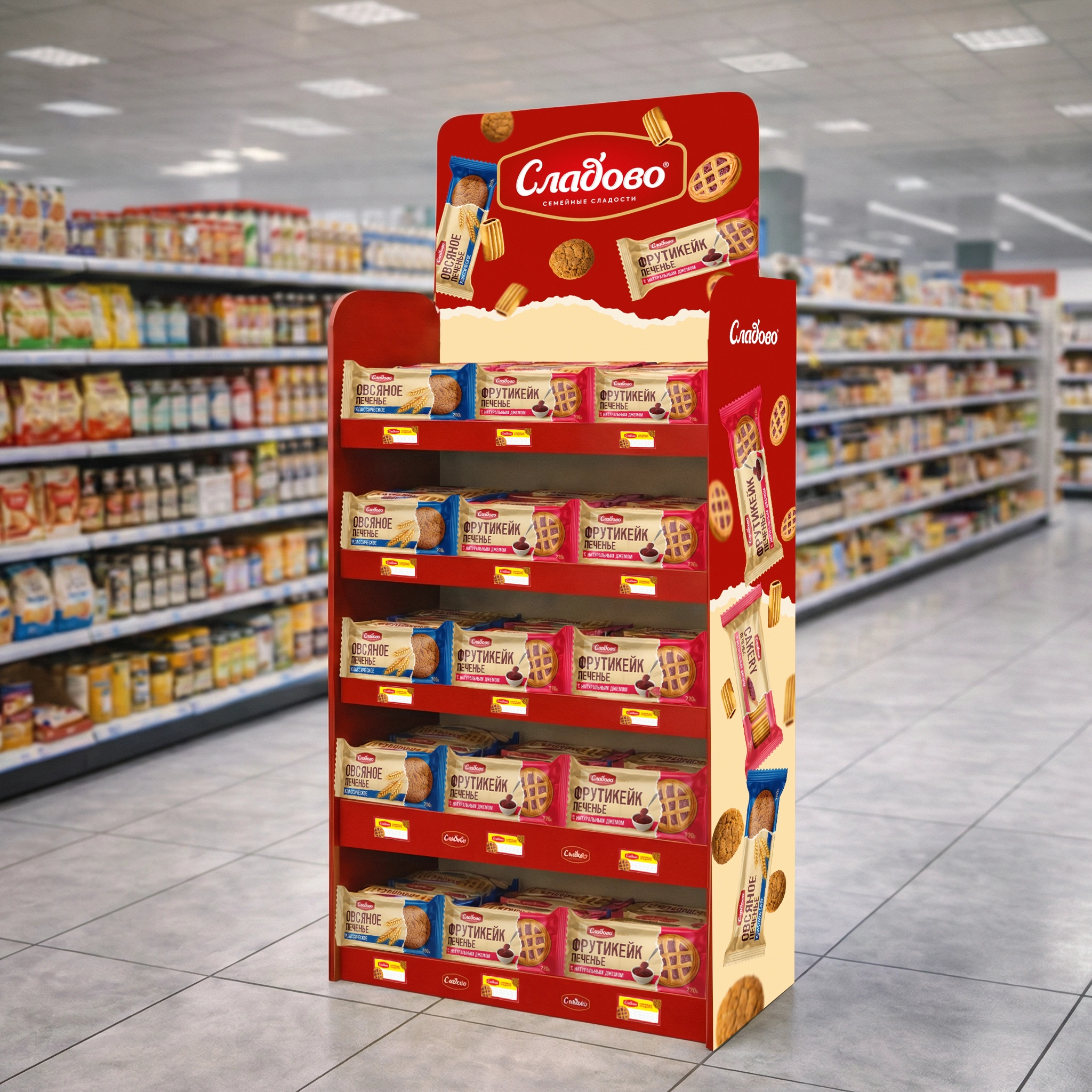 - 视觉设计技巧:如果你仔细看渲染图,会发现每个包装都采用了独特的视觉手法。我们设计出一种“撕开包装”的视觉效果,仿佛包装被撕开后露出了真实而诱人的饼干(例如带有浓郁果酱的“Fruticake”或色彩鲜明的“Mindalki”)。这种设计完美解决了客户“产品必须能被看到”的需求。现在,消费者不是通过单调的透明塑料袋看到产品,而是通过创意十足、令人垂涎的视觉设计来感受产品。