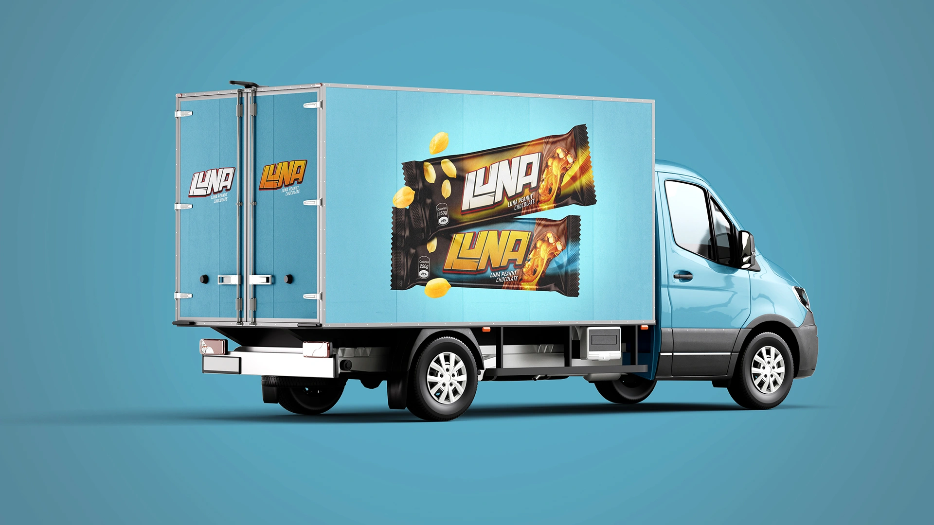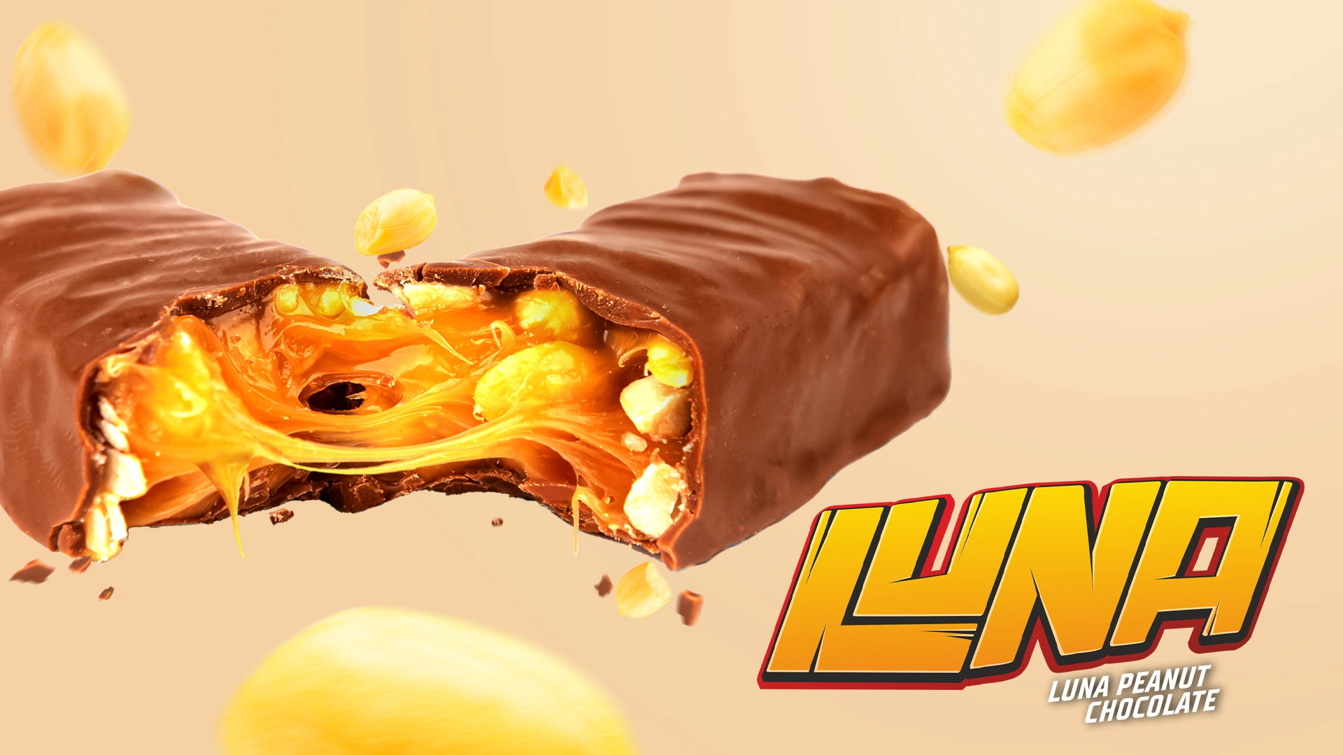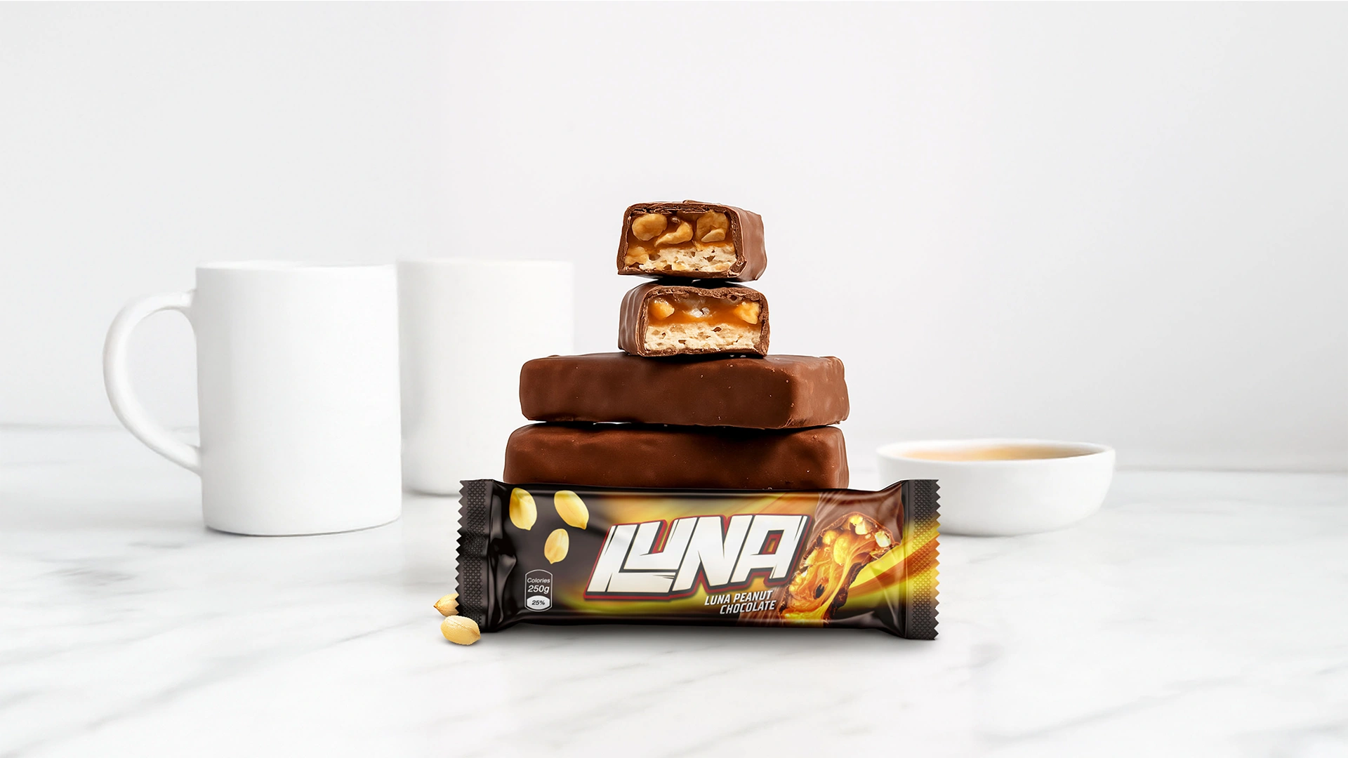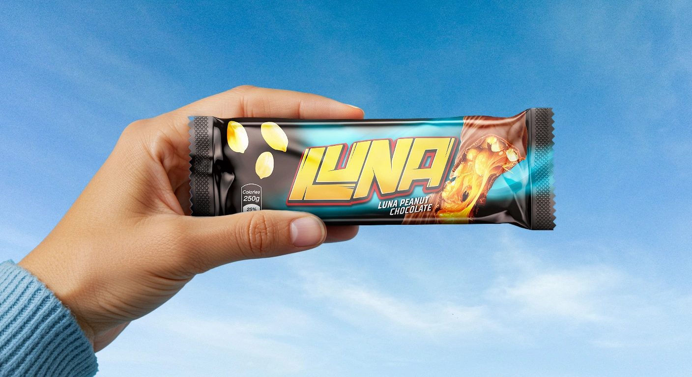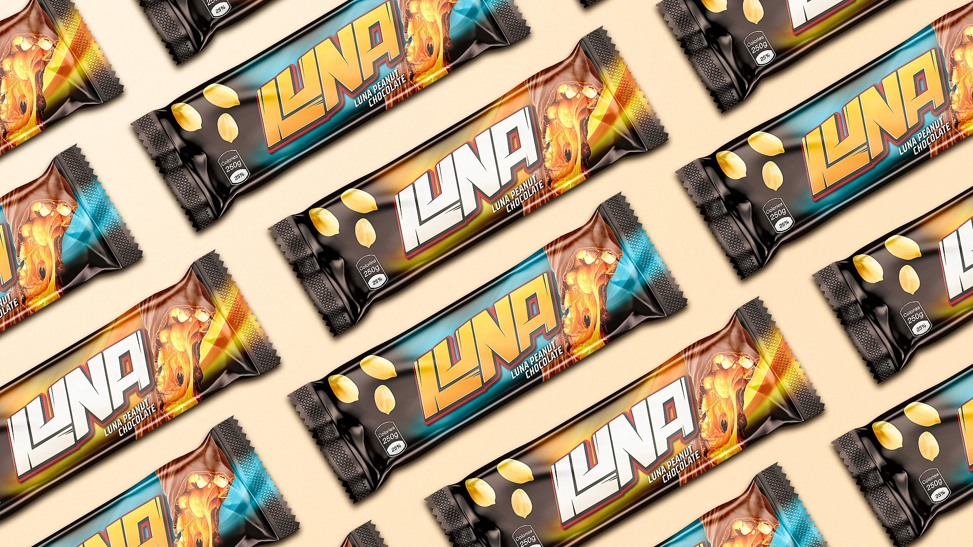 We developed a bright and dynamic packaging design for Luna (chocolate with peanuts). The concept is inspired by comics: aggressive typography, black background, 3D visualization of the bar, and two contrasting packages for visual dominance on the shelf.
