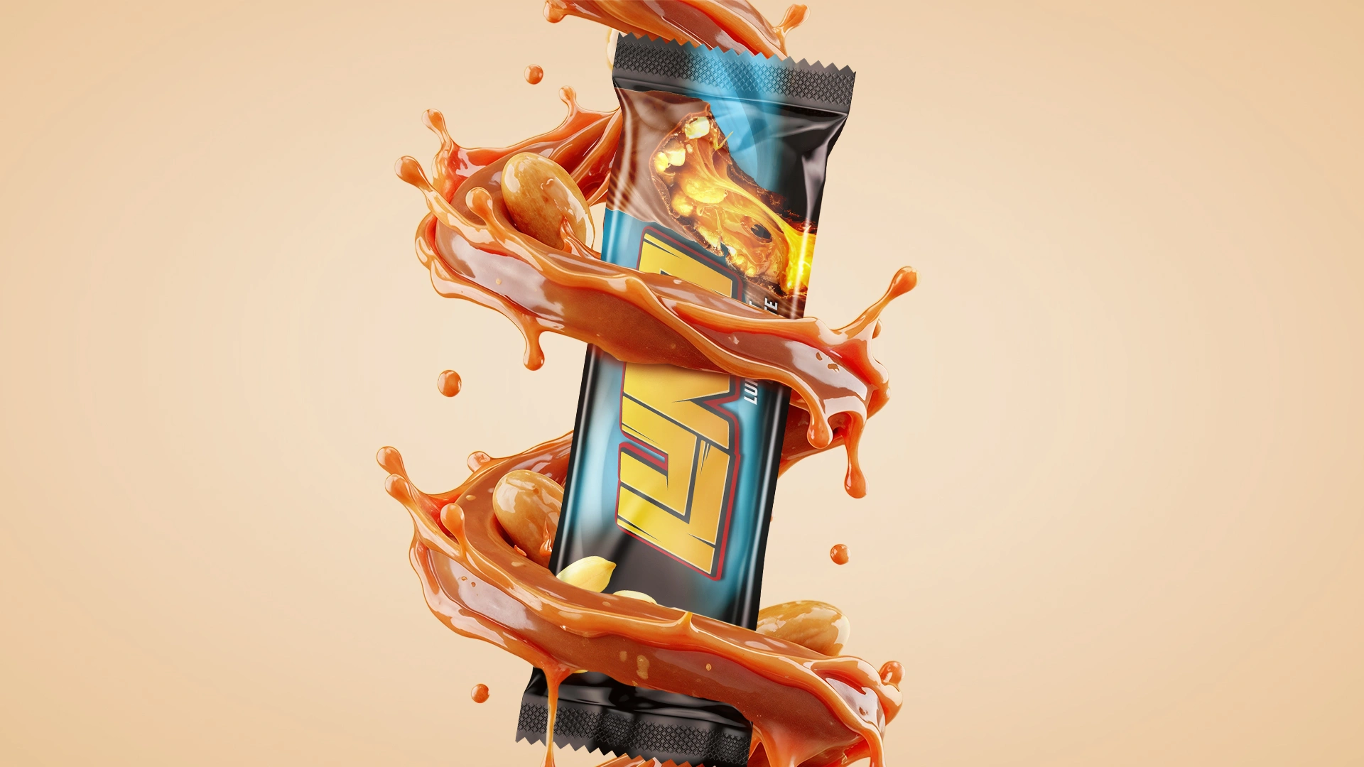 A key element is the 3D visualization of the bar in cross-section — luscious chocolate, gooey caramel, whole peanuts — all rendered to look as realistic and delicious as possible. This is one of the main attention hooks.