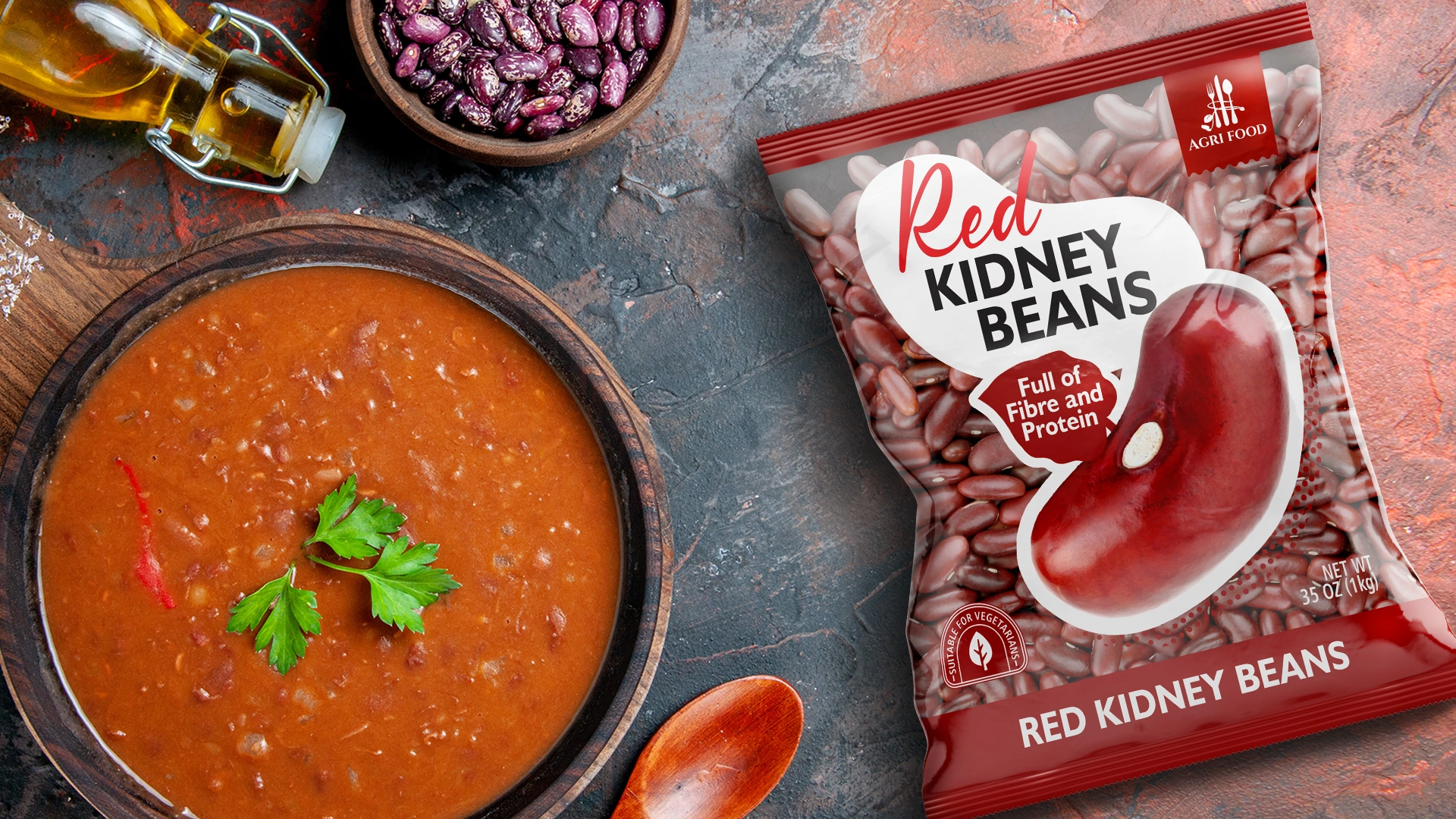 - 3. Европейская подача информации: для названия (Red Kidney Beans, Green Moong Beans) был выбран мягкий, органический рукописный шрифт, который создает ощущение натуральности. Ключевые для европейского потребителя триггеры (Full of Fibre and Protein, Suitable for Vegetarians) вынесены на видное место и выполнены чистым, легко читаемым гротеском.
