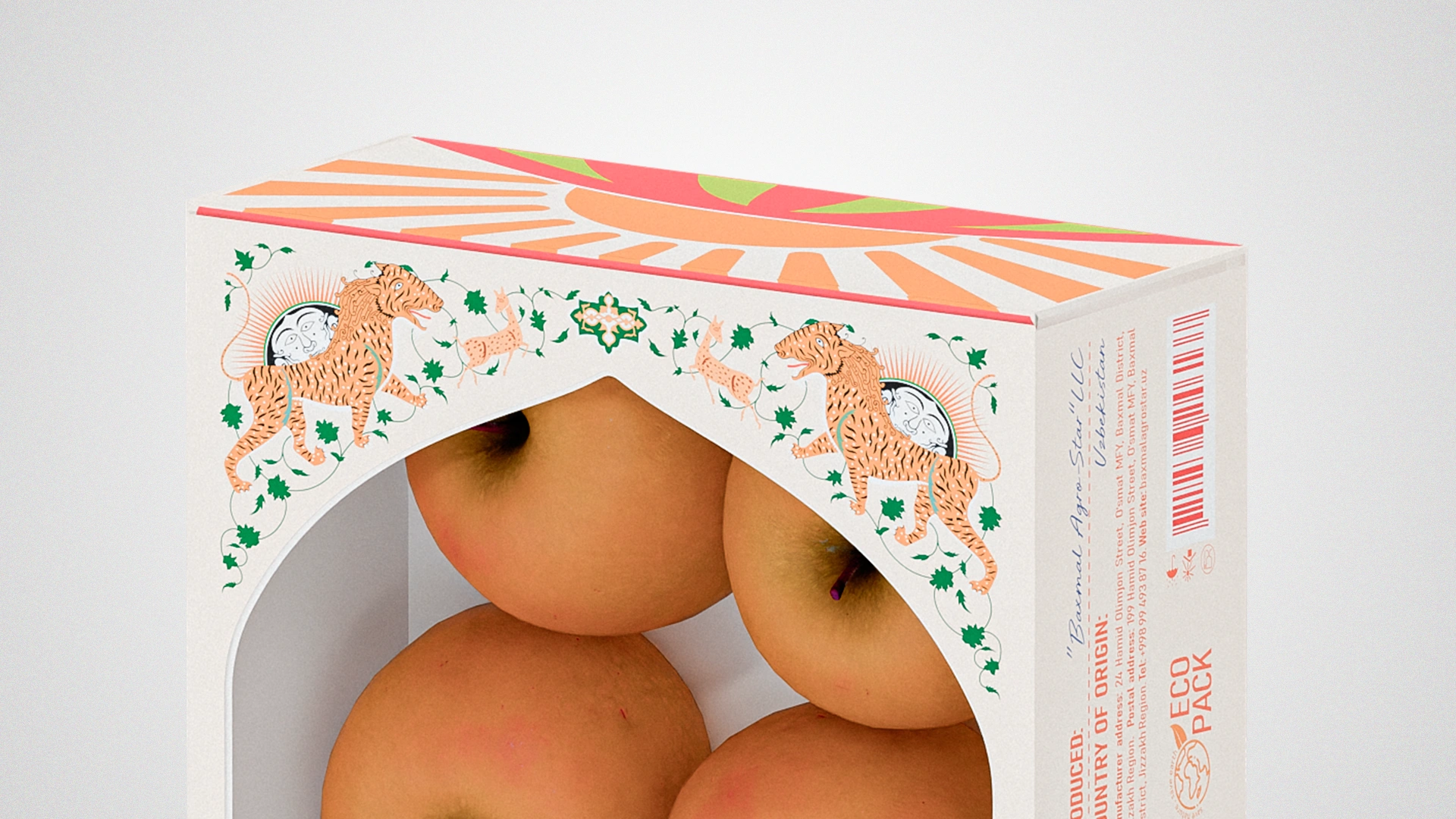 Разработан экспортный дизайн упаковки для UzAgroStar. Культурный код (арки с символами Шердор/Симург) и метафора «посылки» (штампы, Hand Picked) превращают продукт в национальный бренд, повышая его ценность на мировом рынке.