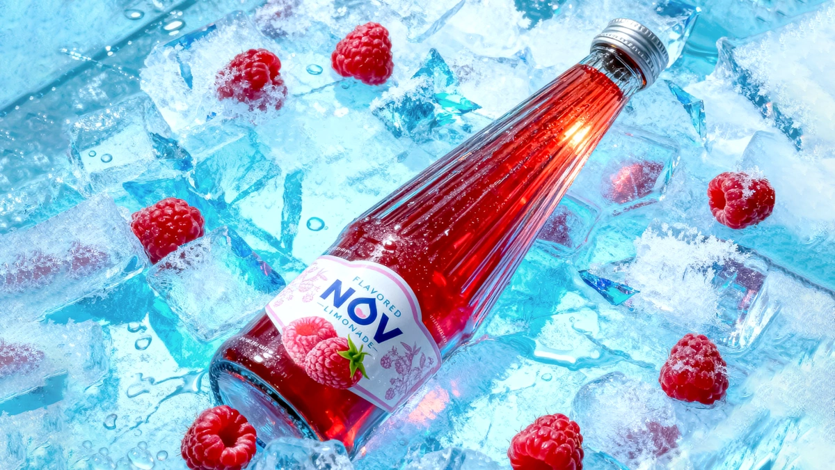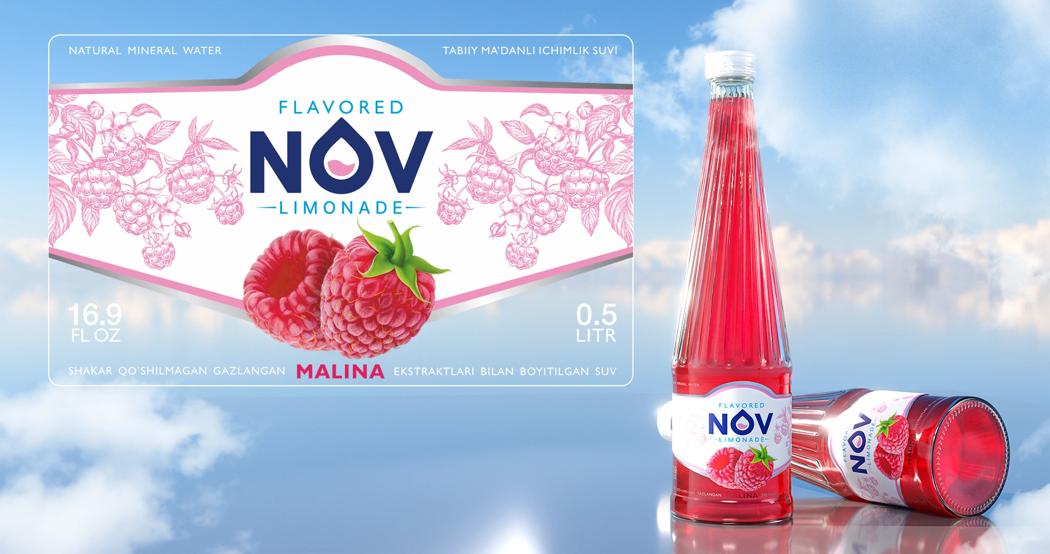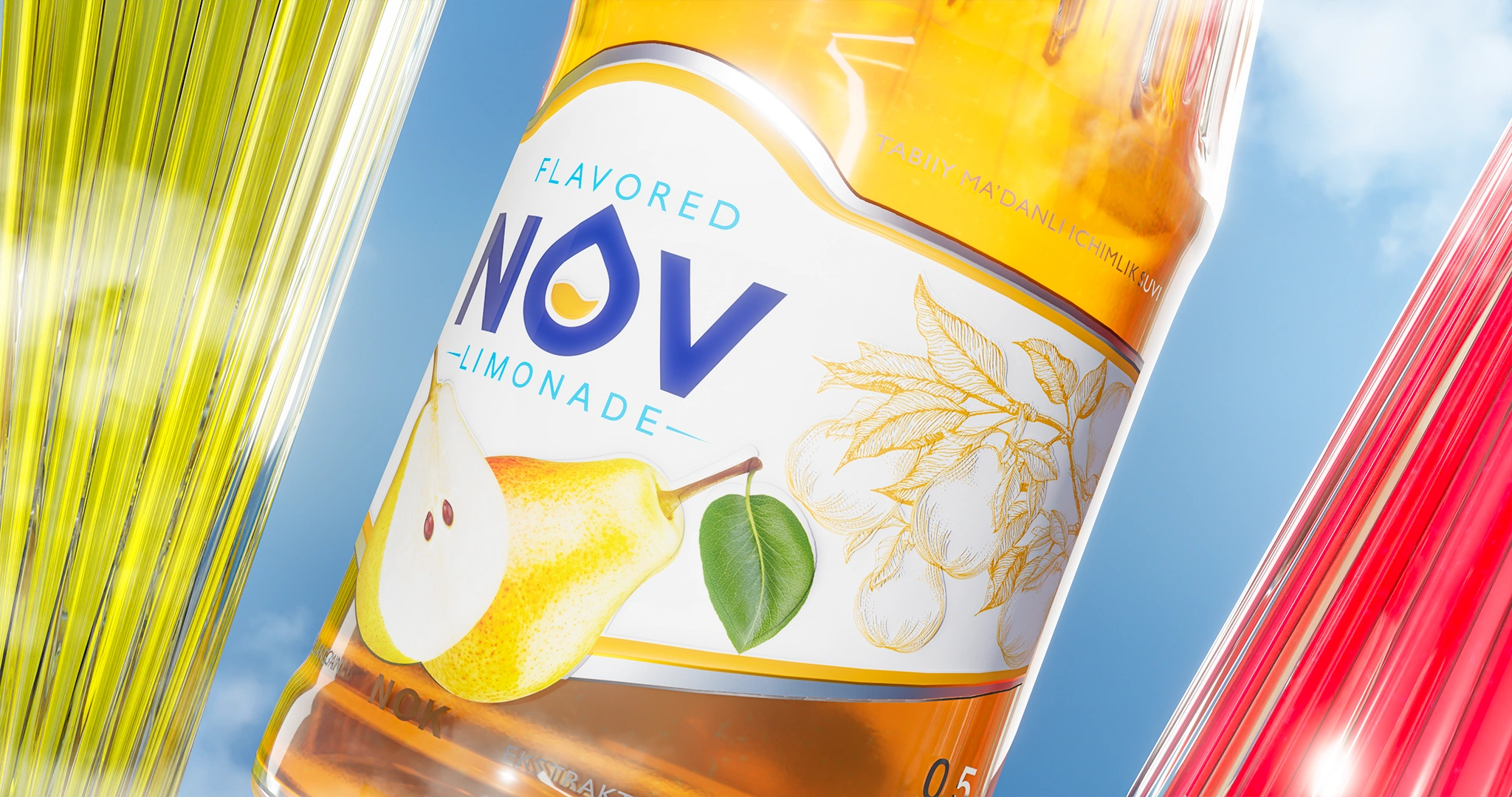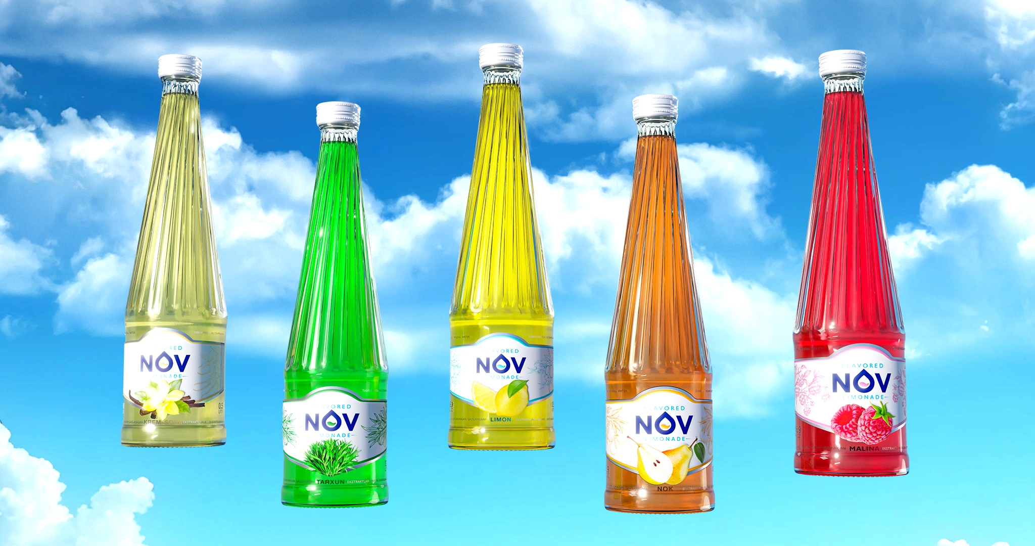 После успешного запуска минеральной воды под брендом NOV клиент пришёл с новой задачей — создать дизайн для линейки фруктовых газированных лимонадов: лимон, груша, тархун, крем-сода и малина. Важно было сохранить фирменную архитектуру бренда и при этом добавить яркость, эмоции и «сочность», ожидаемые покупателем в категории лимонадов.