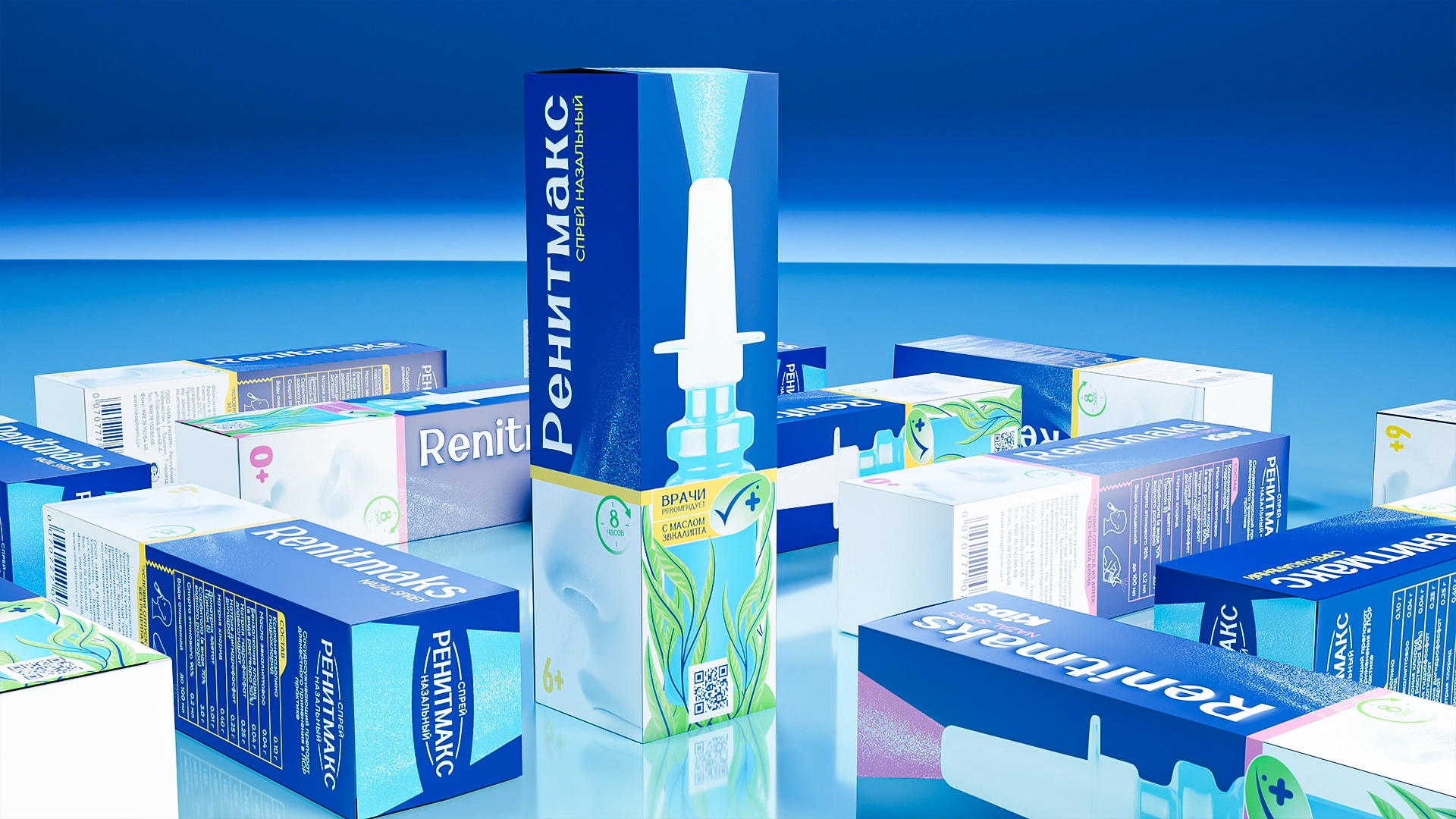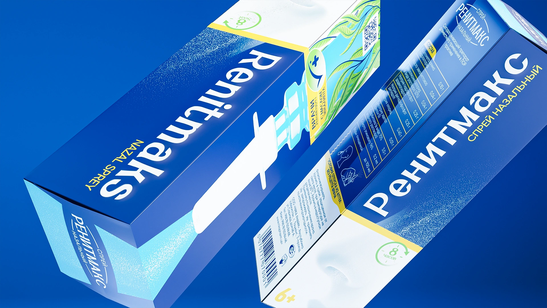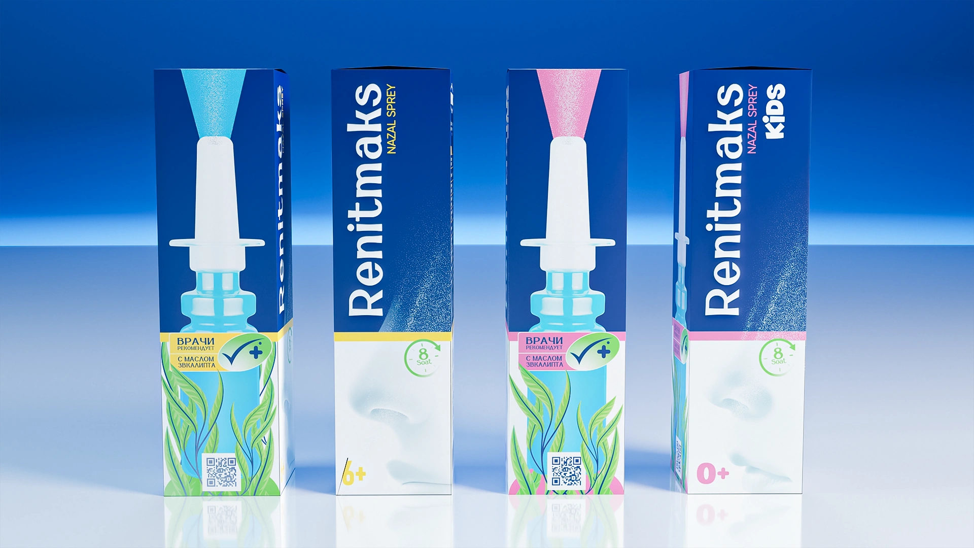 Разработан дизайн упаковки для назального спрея RenitMaks. Насыщенный медицинский синий цвет, листья эвкалипта (природное действие) и вертикальная типографика создают современный, профессиональный стиль и чёткую визуальную архитектуру для аптечной полки.