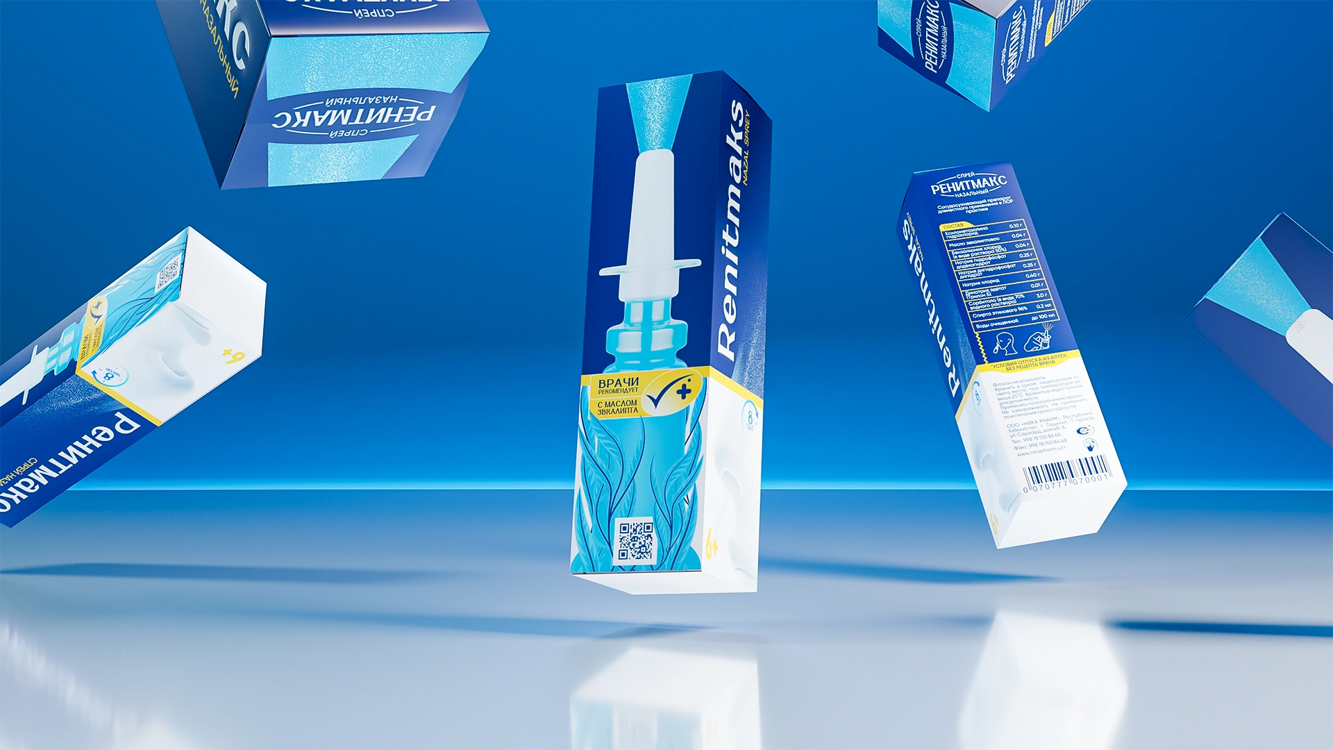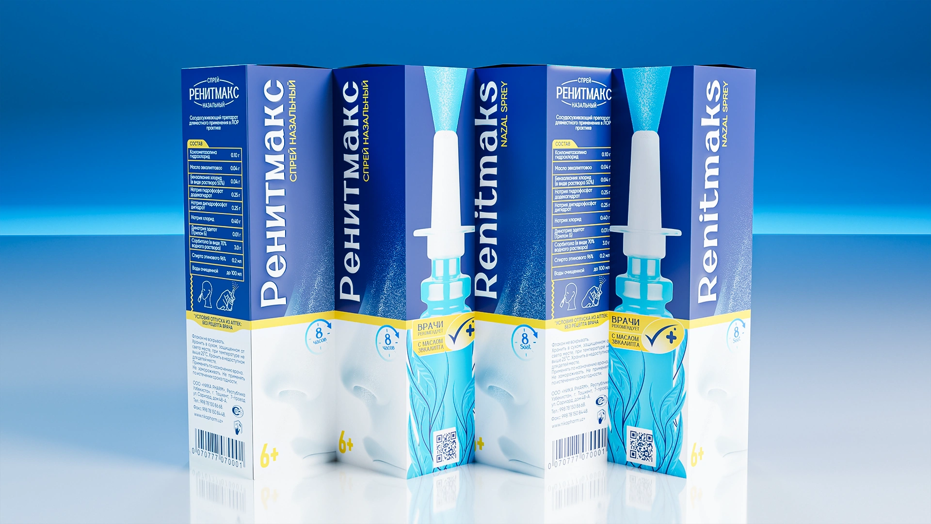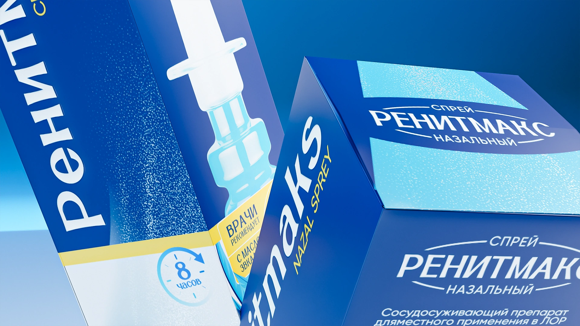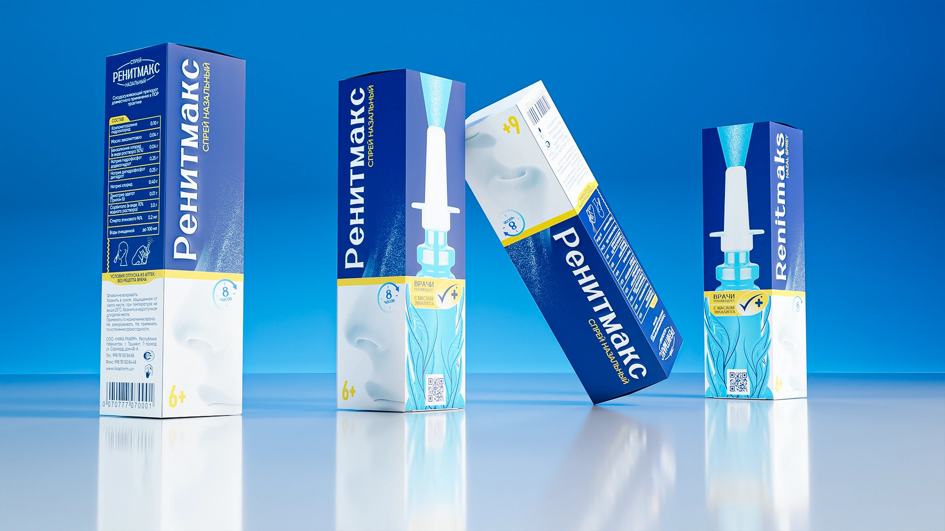 Разработан дизайн упаковки для назального спрея RenitMaks. Насыщенный медицинский синий цвет, листья эвкалипта (природное действие) и вертикальная типографика создают современный, профессиональный стиль и чёткую визуальную архитектуру для аптечной полки.