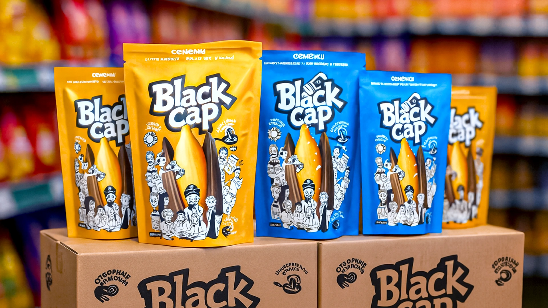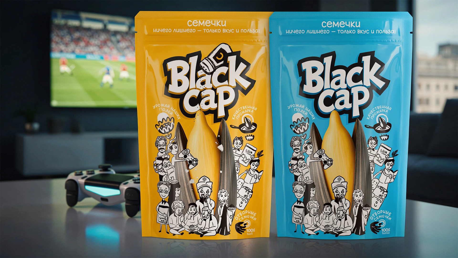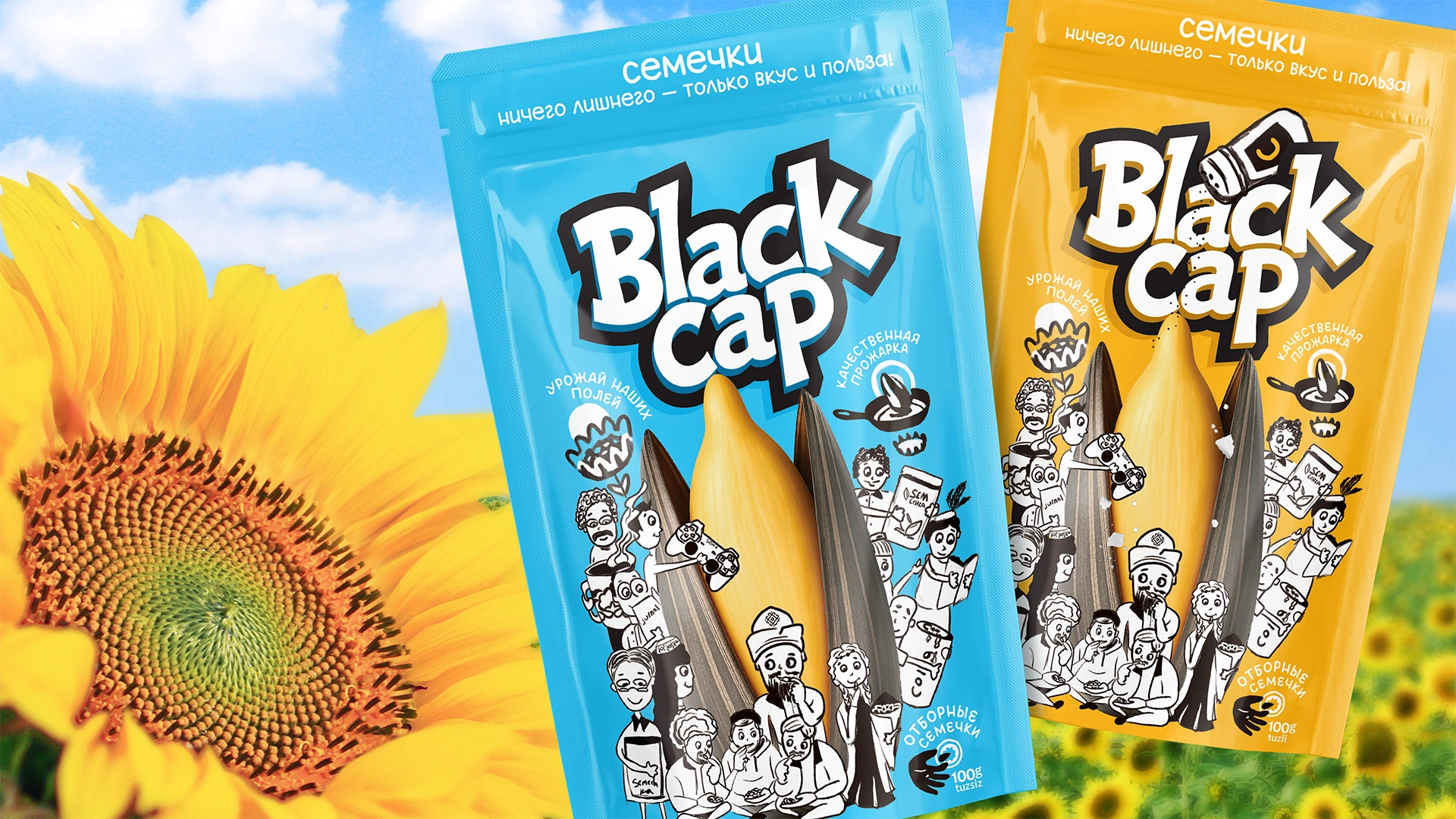 Проведен полный ребрендинг семечек: новое имя Black Cap ("Чёрная шапка") с культурным кодом Каракалпакстана. Дизайн с серией иллюстрированных персонажей (социальный ритуал) и яркой цветовой дифференциацией (желтый/синий) для завоевания локального рынка.