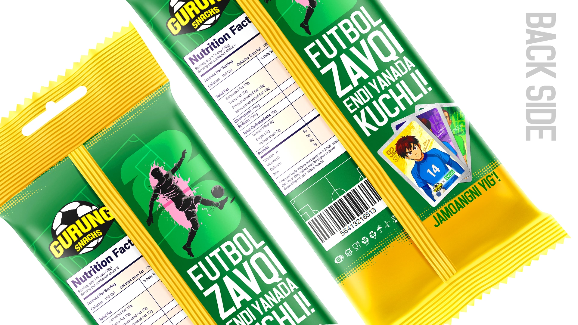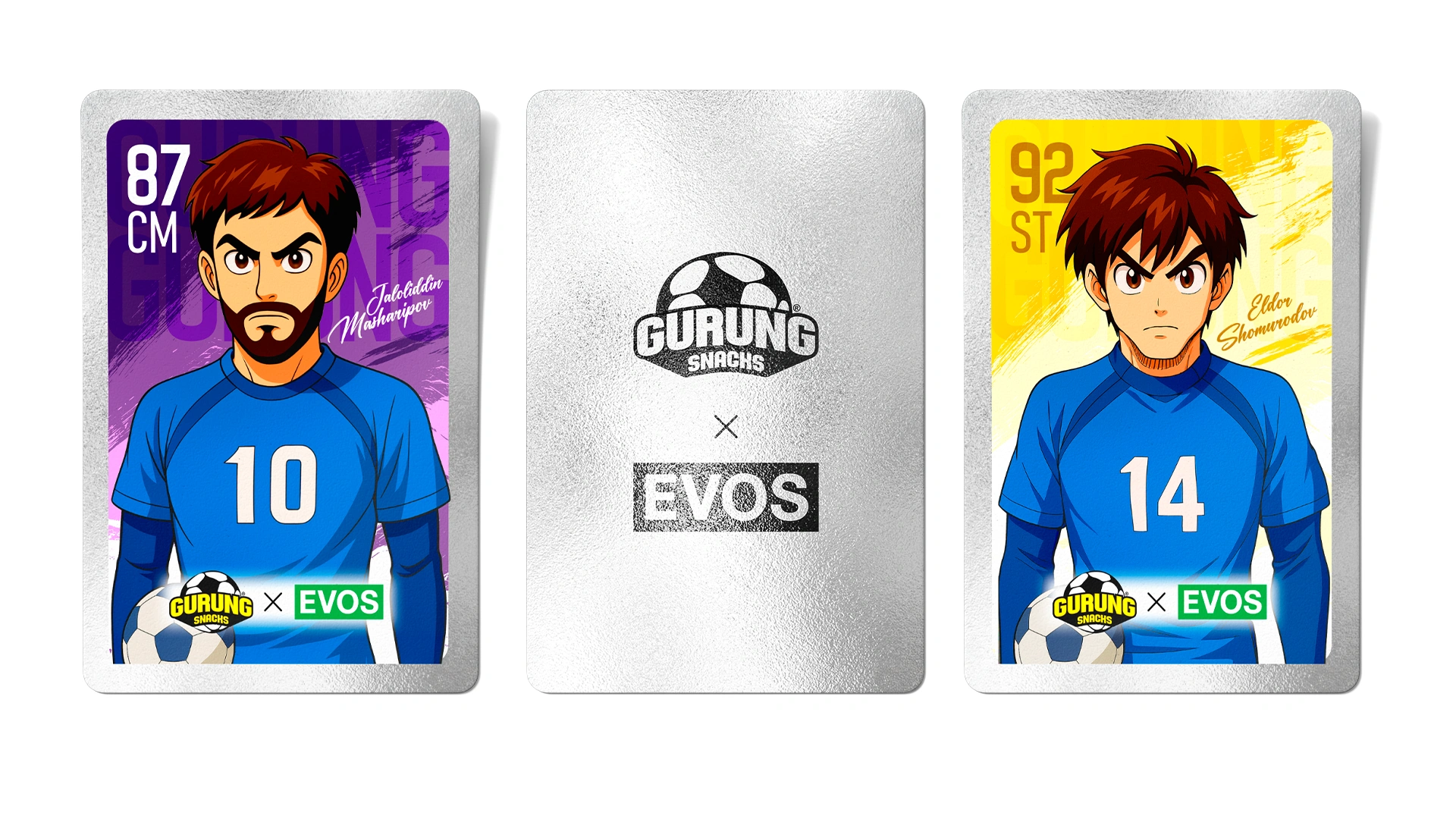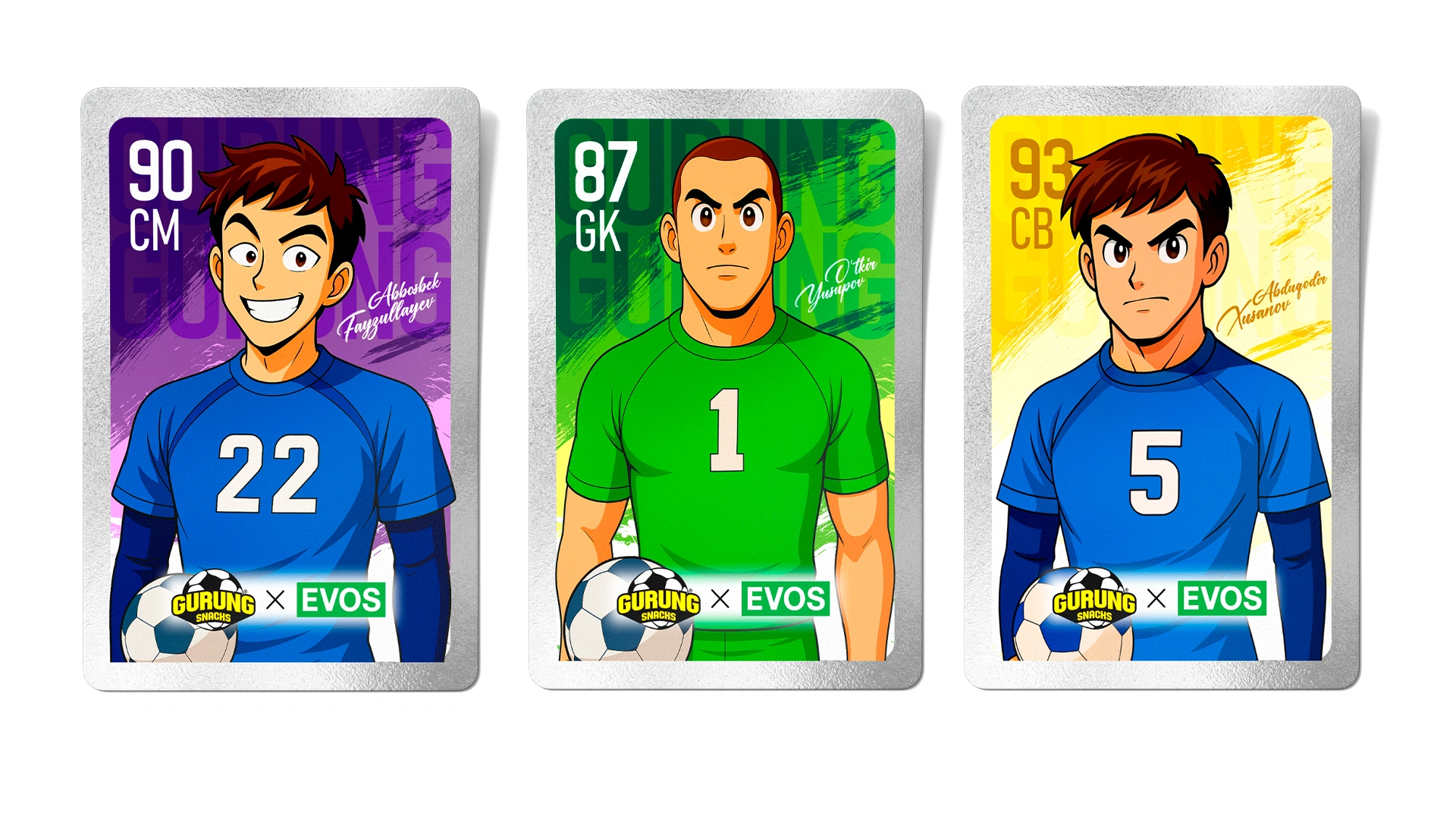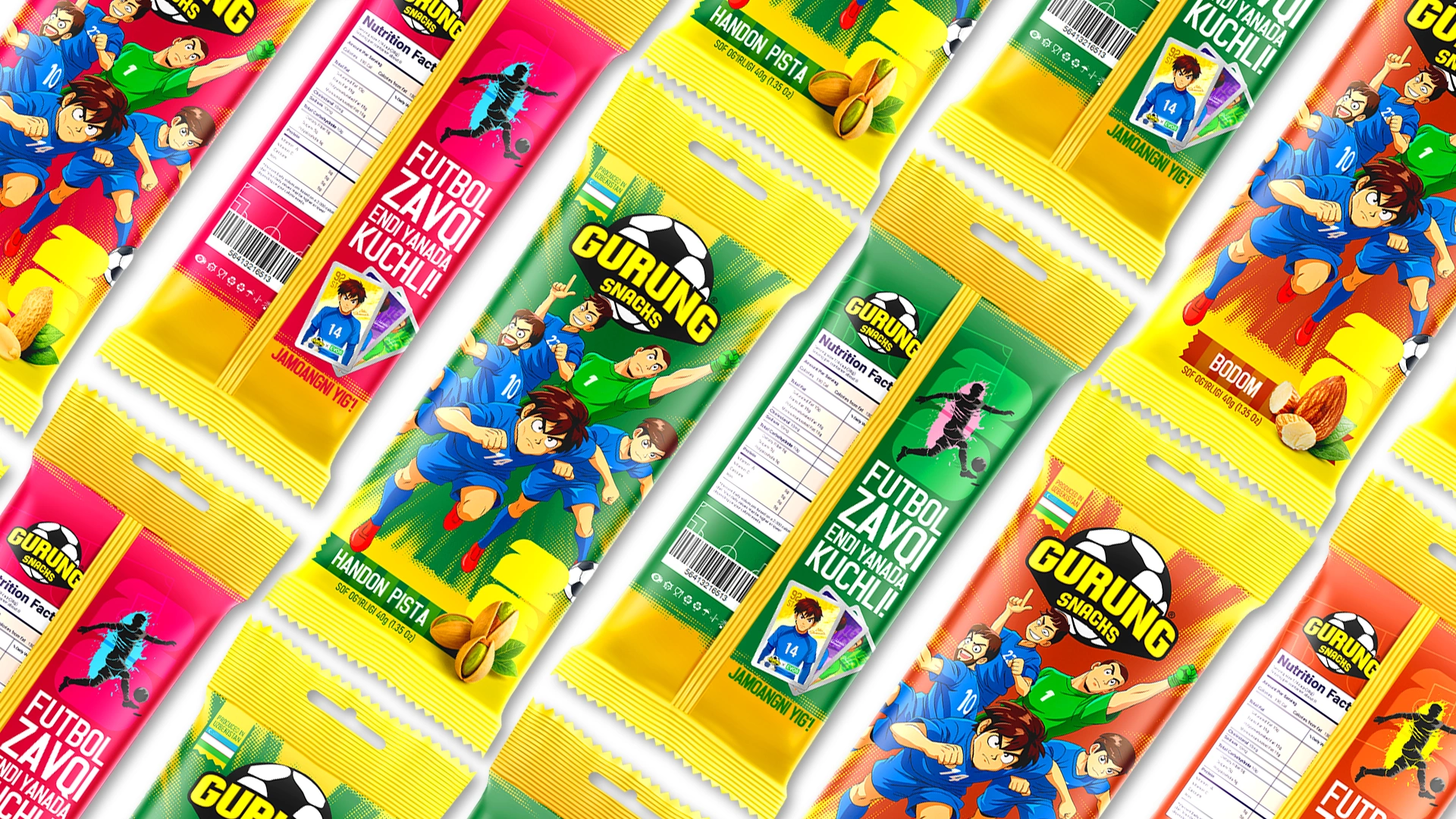 Разработан бренд Gurung Snacks ("вкус общения") на основе культурного кода Узбекистана и футбольной тематики (ЧМ-2026). Дизайн в стиле аниме с героями-футболистами и геймификация через коллекционные карточки стимулируют повторные покупки и национальную гордость.