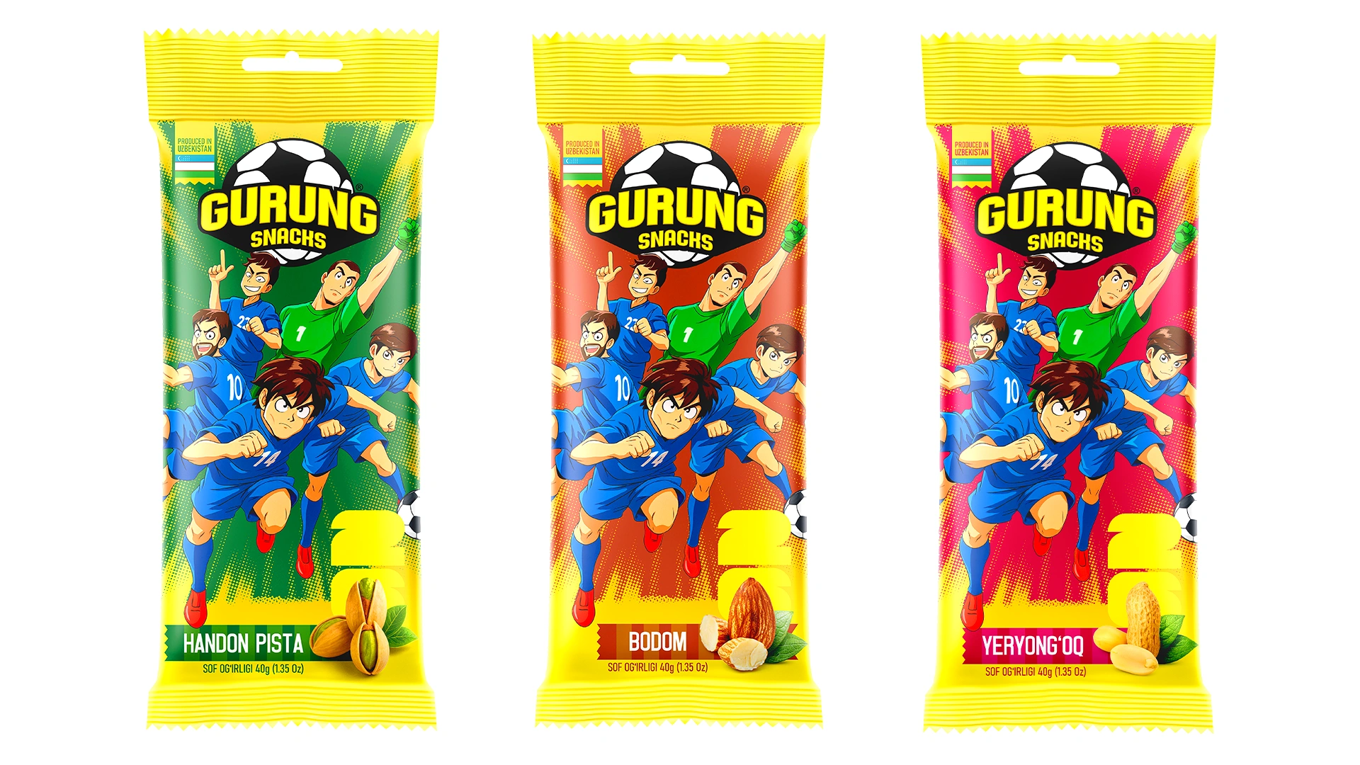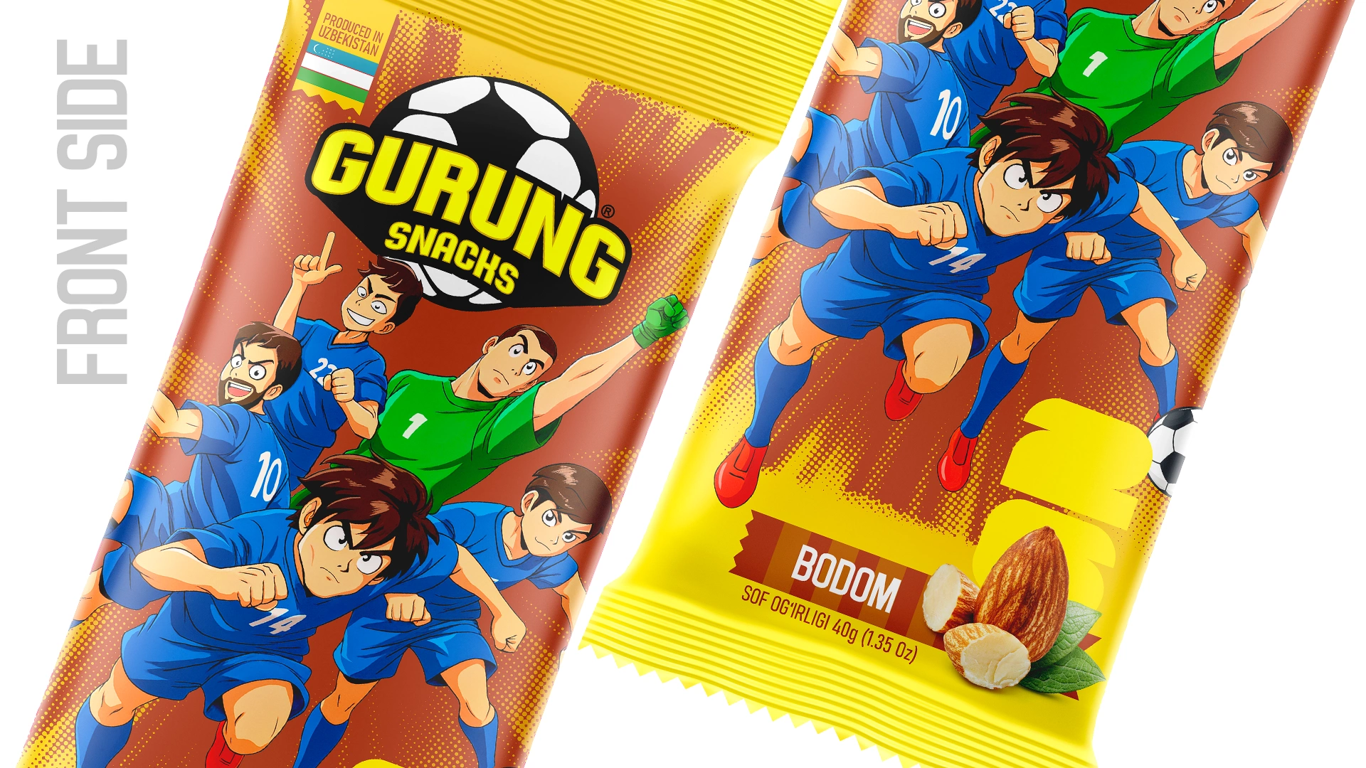 2025 год стал особенным для страны: сборная Узбекистана впервые пробилась на чемпионат мира по футболу. Мы соединили этот исторический момент с культурой «гурунга» и превратили футболистов в супергероев бренда. На упаковке они оживают в стиле аниме и комиксов — смело, динамично и с энергией победы.